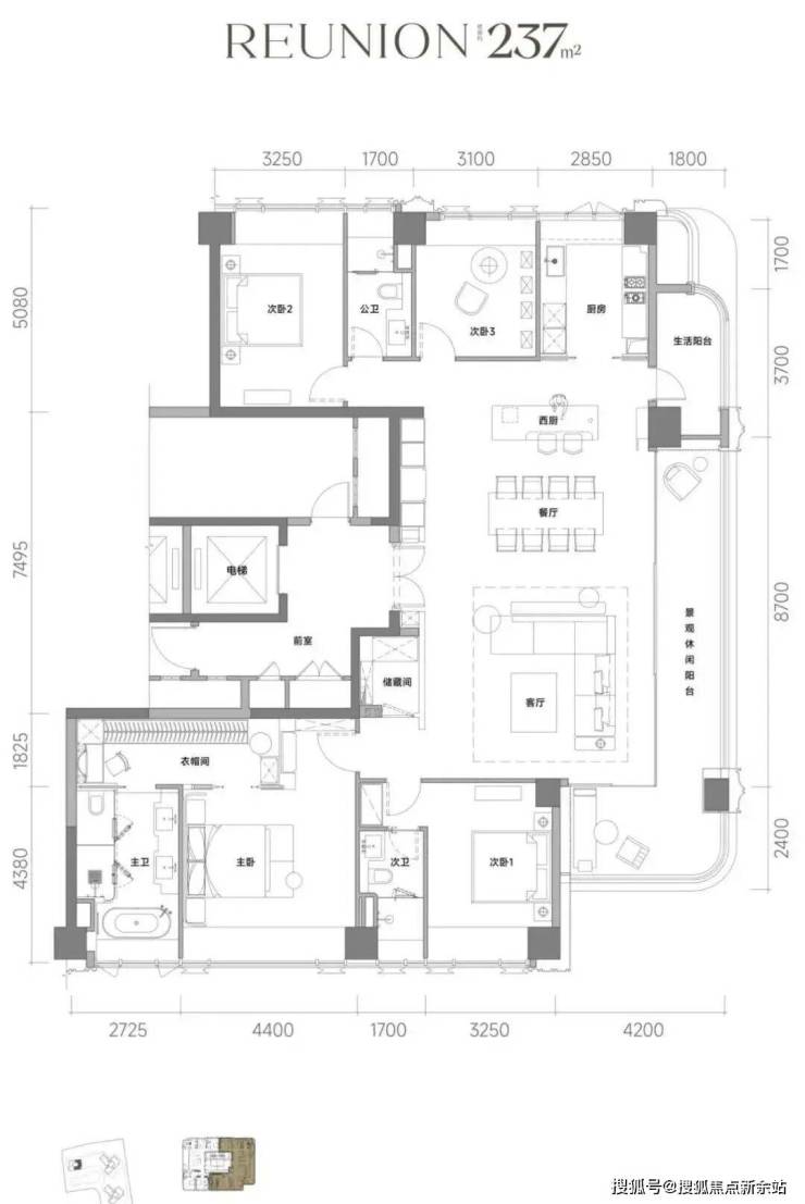 237户型还搭载了长约18.8m的270°环幕式双阳台,除了景观阳台和生活阳台的功能区分,更增加了“X”百变空间,实现场景与功能的无限延展。