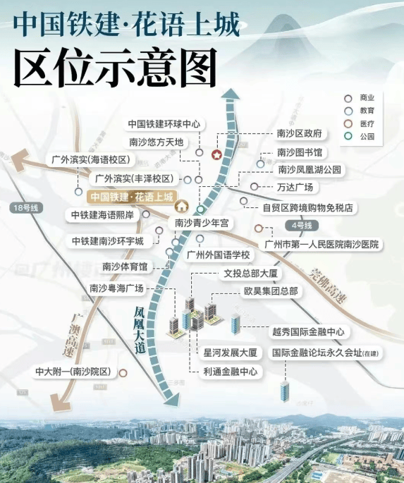 花语上城坐落于南沙政务与城市发展的双核交汇点——凤凰大道中段,紧邻区政府板块与明珠湾起步区。这条贯穿南沙南北的“黄金中轴”,串联起蕉门河中心区、灵山岛尖、横沥岛、万顷沙等高能级板块,是南沙未来十年城市骨架的核心脉络。
