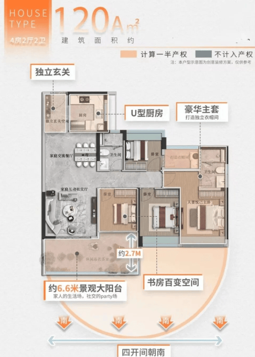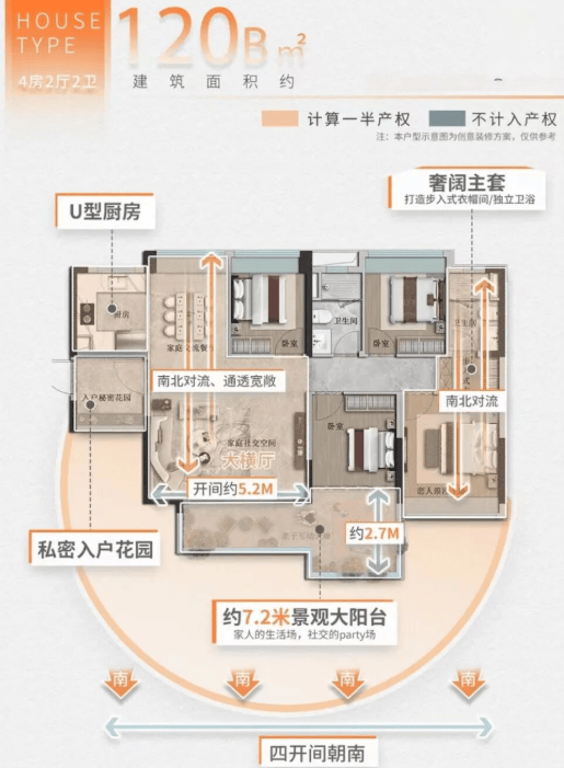 120㎡四房(A/B双版本):A户型可打通客厅与卧室,打造大平层式奢阔空间;B户型为稀缺横厅设计,带入户花园,四房均方正实用。