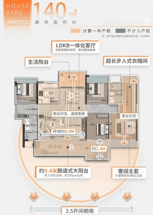 140㎡四房全景大宅:约9.4米跑道式阳台,南北通透,客厅与主卧空间感超越部分170㎡产品,家庭聚会、观景休憩皆从容不迫。