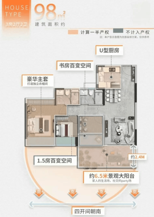 98㎡三房两厅两卫:书房改造后进深达6米,适合多孩家庭;6.5米景观阳台,尺度堪比改善户型。