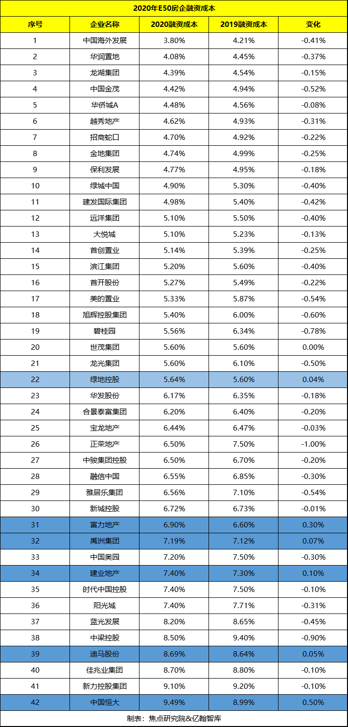 融资成本是体现房企盈利能力及市场竞争力的重要指标。近日,焦点研究院、亿翰智库就50家A+H股典型房企进行了深入分析发现,过去一年,房企的融资成本呈现普遍下降的趋势,该50家房企的平均融资成本为6.11%,同比2019年的6.37%下降0.26个百分点。