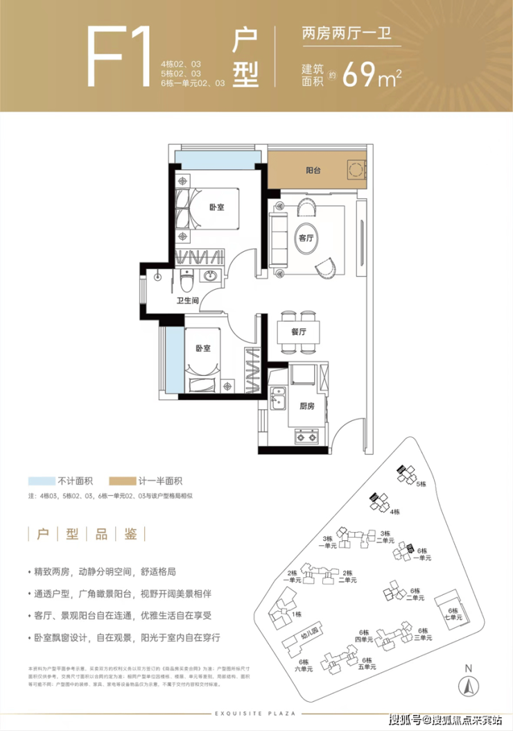 69㎡的2房2厅1卫,得房率:72.94%(不含赠送),西北向看坪山河景观或东北朝向面向锦龙大道。