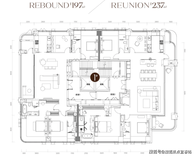 两个户型都是四房三卫+家政间设计,进门就是大客厅,卧室分布于客餐厅南北两侧,均拥有超大观景阳台。