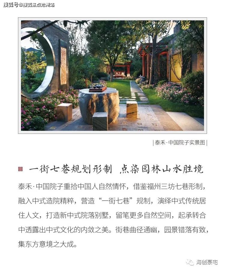 作为中国较佳园林工程少有获奖别墅项目,泰禾·中国院子深研中式古典建筑,凝练出“坊巷”“门头”“庭院”三大造院体系。以福州三坊七巷为蓝本,形成专属定制的一街七巷的巷坊体系;引入中国世家宅门体系,以青石阶、柚木门、抱鼓石、影壁浮雕……彰显国宅门第之感。