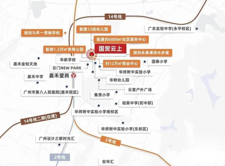 教育配套是该项目的一大亮点。国贸云上自身配建12班幼儿园,西北侧规划有九年一贯制学校,已纳入培英教育集团体系。周边教育资源丰富,3公里范围内有108所幼儿园及学校,包括华师附中实验小学第二小学、白云区永平街中心幼儿园、培英中学、嘉禾中学、广东实验中学等,形成较为完善的教育链条。