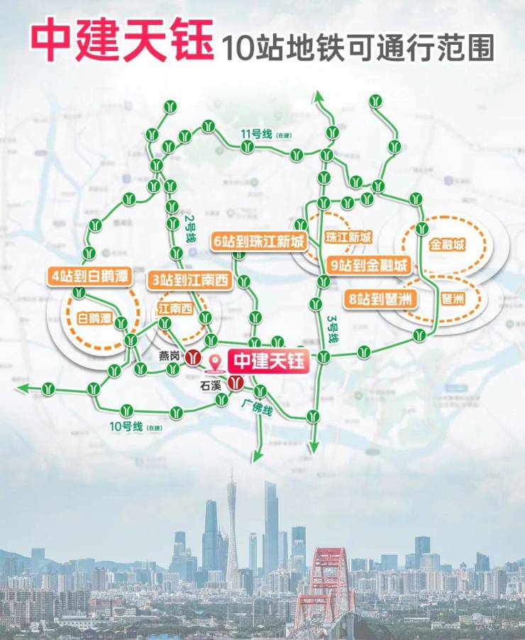 项目坐拥双地铁优势:广佛线石溪站(步行约750米)和燕岗站(步行约900米),燕岗站同时为11号线换乘点,可快速通达琶洲、天河等核心区;石溪站未来为广佛线与10号线换乘站,直连珠江新城。
