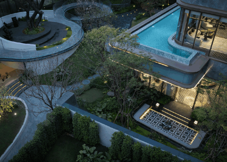 蜿蜒起伏的林间小径,连接其高低不一的环形浮岛,浮岛中央生出挺拔的古榕树,浮岛之下又别有天地,度假感油然而生。