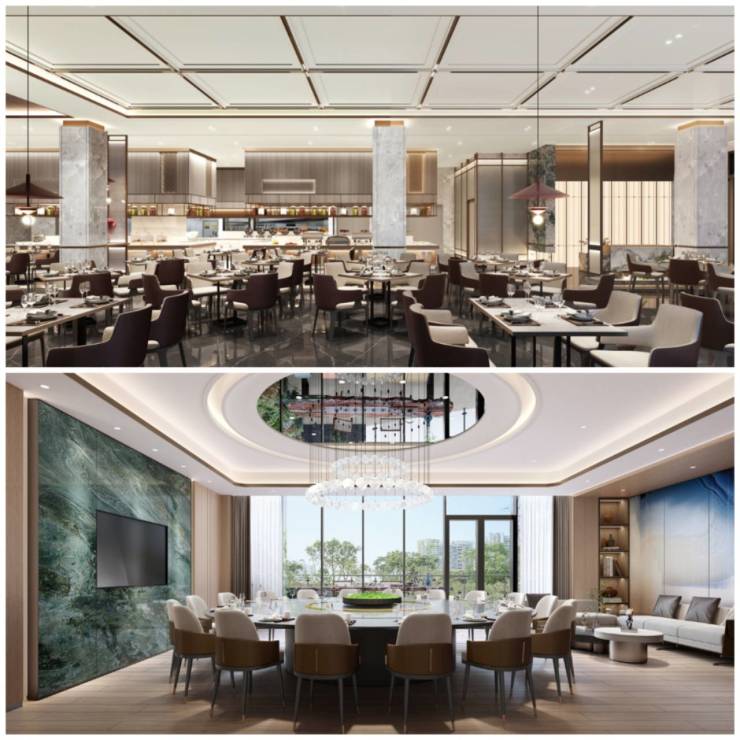 多元餐厅: 社交会客进阶空间承接多元会客功能,亲友接待、商务会谈、节日聚会等皆可,缤纷美味犒赏,延展志趣圈层的精质体验,提供多元社交场景。
