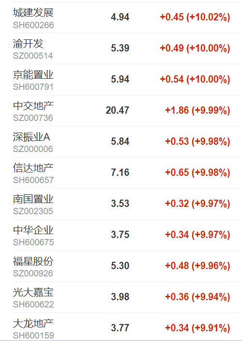 中国武夷、天保基建、城建发展、京能置业、渝开发、中交地产、信达地产、中华企业、南国置业、福星股份、光大嘉宝、大龙地产、世茂股份、深振业A等多只地产股开盘涨停。