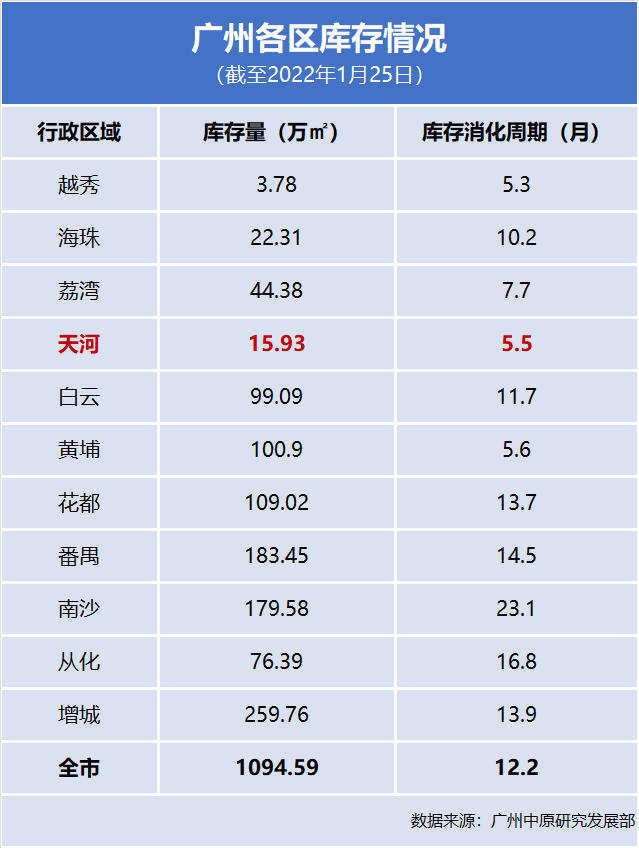 据广州中原研究发展部数据显示,截止到1月25日,天河库存仅剩15.93万㎡,库存消化周期不足6个月,供应十分紧缺!