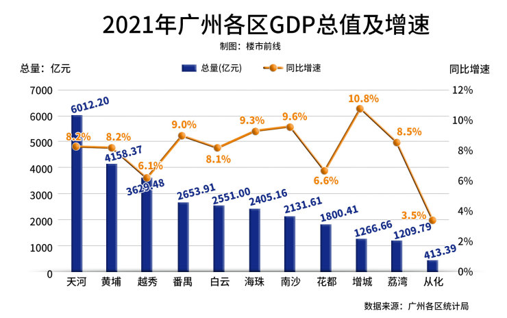 在刚刚过去的2021年,天河GDP再次“提档”,突破6000亿元,位居全市排名前列,与第二名黄埔之间,整整相差了约1800亿!
