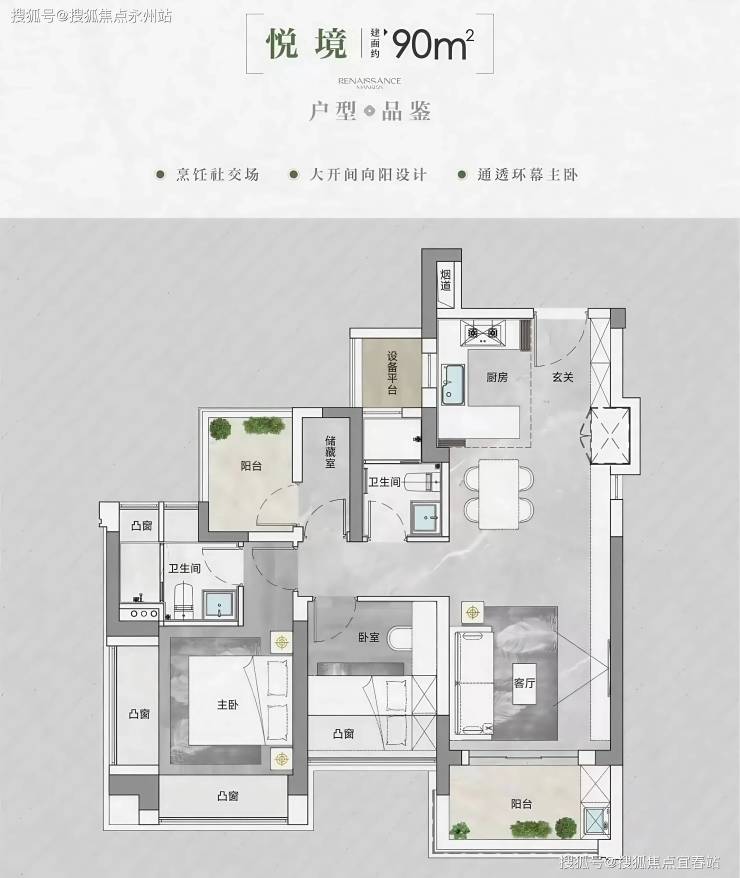 95㎡户型:阳台+3卧室同一个朝向,如果是东南或者西南,这种户型的采光会非常的不错;缺点就是:走道过长,有点浪费空间;主卧的设计很有意思,双飘窗南北通透的格局,而且主卧的卫生间相对而言比较独立。