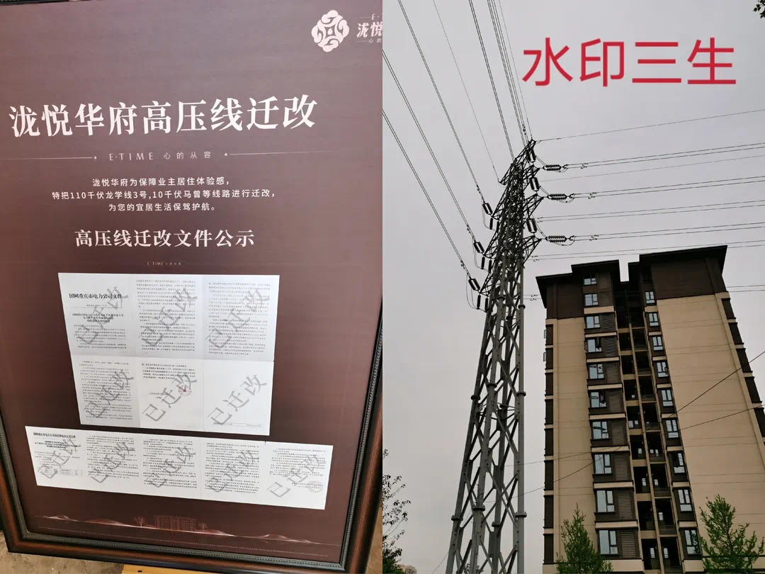 资本雄厚的中国电建2018年跨领域进重庆房地产市场,确实谈不上什么品牌号召力。但是也不乏闪光点,比如我说的高压线通病,据说泷悦华府开盘的第二天,红头文件一下就开剪了。下图右是我经过水印三生时随手拍的。大多数的承诺到兑现距离太长了。又比如电建打造的四大产品系,泷悦系虽然偏高端,但开发商控制户型面积和总价,降低门槛,与市面比近十多万的价格差,对年轻客户群非常友好。