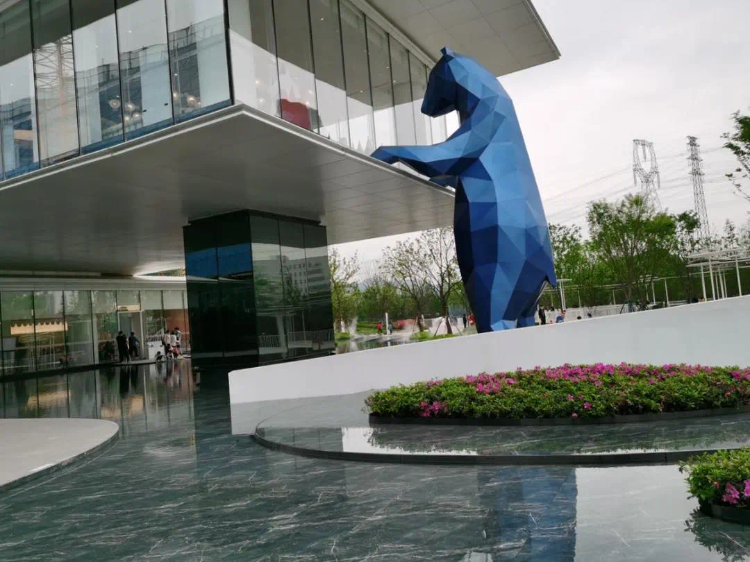 我们从简约明了的大门口进来,经过曲径通幽的竹林,才得以探知真貌,颇有几分犹抱琵琶半遮面的效果。入目大面环水、设计前卫的两层售楼中心及探窗的大熊,给我的排名前列感觉就是国金中心创意的改版。