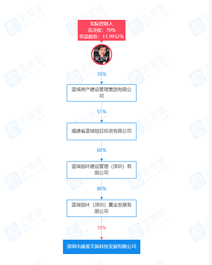 企查查股权穿透后可知,注册资本5000万元的蓝城伽叶置业法定代表人为张世婷,由蓝城伽叶建设管理(深圳)有限公司持股80%。而后者的实际控制人为宋卫平。新增公司“深圳市康蓝文旅科技发展有限公司”的实控人和最终受益人也为宋卫平。