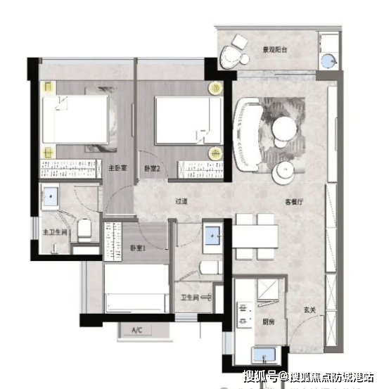 【C2户型】:南朝向,3室2厅2卫,建筑面积110㎡,分布于3号楼、1号楼。相较于C1户型,该户型空间更宽敞,主卧面积更大,配备独立衣帽间与卫生间,储物空间充足。客厅连接阔景阳台,可俯瞰社区园林景观,居住体验更佳。