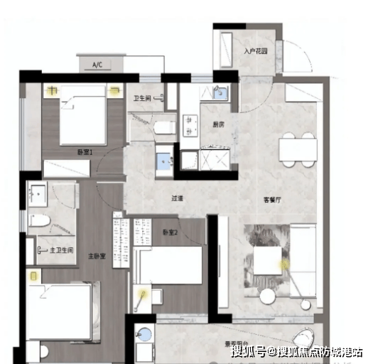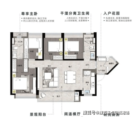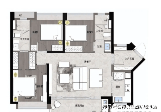 【C1户型】:南朝向,3室2厅2卫,建筑面积106㎡,分布于3号楼、1号楼。南向户型采光通风极佳,客厅与餐厅相连,空间开阔通透。主卧带飘窗设计,增加使用空间与观景效果,卫生间干湿分离,提升居住舒适度,适合改善型家庭。