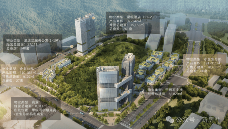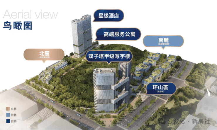 业态:集合双子塔甲级写字楼、低密度组团(北麓、南麓)、星级酒店、商业等一体的城市综合体