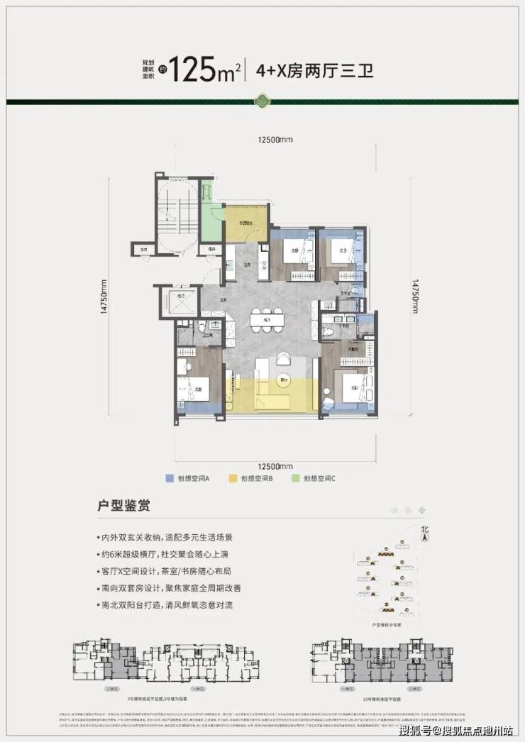 约125㎡户型南向客厅开间提升到了约6m,大四房、南北双阳台,再加X空间,改善客户在这能实现再进阶