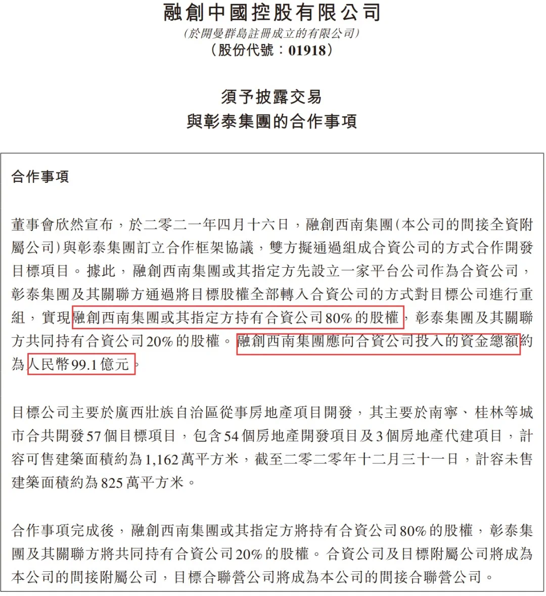 从公告内容来看,融创与彰泰的合作方式和旭辉之前公布的相差无几,不过更具体了:双方共同设立合资公司,接手彰泰集团所属目标公司100%权益。交易对价约99.1亿元,交易完成后,融创西南集团与彰泰集团将分别持有合资公司80%及20%股权。