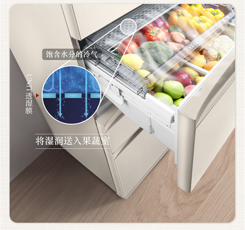 这款东芝485冰箱有专门的果蔬室,采用的是雾化保鲜科技,搭载了UNIT透湿膜技术,具体的工作原理我记不清了,大概就是东芝UNIT透湿膜技术能够做到透湿不透风,能够实现稳定的高保湿环境,即使长时间存放蔬果,也可以让蔬果保持在一个很鲜嫩的状态。