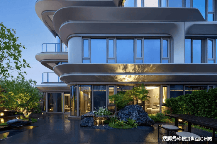 建筑设计:汲取扎哈·哈迪德的流动曲线灵感,采用铝板线条模拟湖面波动,搭配大面积弧形玻璃幕墙,打造“超流体立面”与“全面屏豪宅”概念,窗墙比极高,最大化引入自然景观。