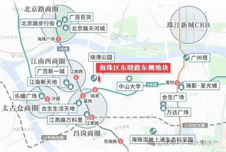 距离地铁8号线晓港地铁站仅0.6km,8号线可以直达琶洲、客村等商务圈,一站到昌岗可以换乘2号线,到南站、白云新城也比较方便,三站客村换乘3号线,到珠江新城、体育西路,能实现40min内通勤。