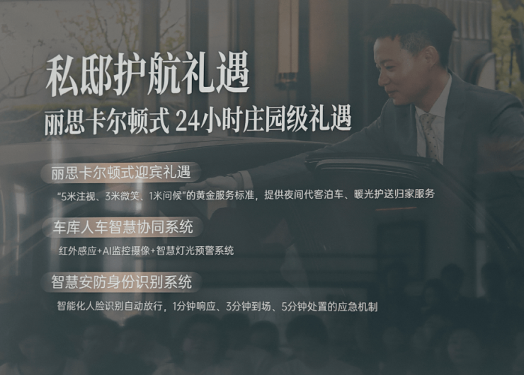 物业团队未来可提供花园养护、光伏报建、隐形家政、外卖上门等永续服务,并配备丽思卡尔顿式24小时礼宾待遇,包括智慧车行系统、红外安防、身份识别等。