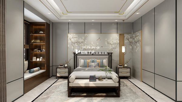 主卧、次卧与衣帽间延续整体的中式轻奢风格,卧室是休息的地方,是一个私密空间,这里是最能体现主人特质的地方。卧室以素净的雪花白为主色调,搭配中式花样和部分深色木色家具,让整个休息区域充满舒适、淡雅的气质。简约的卧室装修和时尚的衣帽间放大了空间感,让主人在这个私密区域获得自由的生活体验。