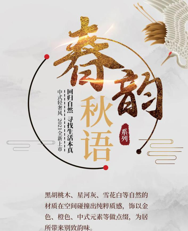 春韵秋语这个系列,讲究的是和谐感。春韵秋语系列在整体的装修中加入了对于自然人生的哲学思考,因此全屋定制中会以黑胡桃木、星河灰、雪花白等充满自然格调的自然材质为主,在视觉上给人古朴自然的全新感受;同时,金色、橙色丰富色彩元素的运用,又给空间以明亮优雅的质感。整体装修以中式元素贯穿,在不动声色中彰显东方气度。