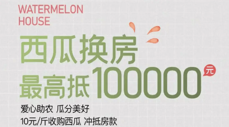 6月28日,继建业“小麦换房”“大蒜换房”之后,位于南京的新城·云漾滨江项目推出了“西瓜换房”活动。海报打出“爱心助农,瓜分美好”10元/斤收购西瓜,冲抵房款,较高可抵10万元的醒目噱头。活动承诺:凡购买新城·云漾滨江房源即可参加“西瓜换房”活动,每套房收购上限为1万斤。活动时间自2022年6月28日至7月15日。