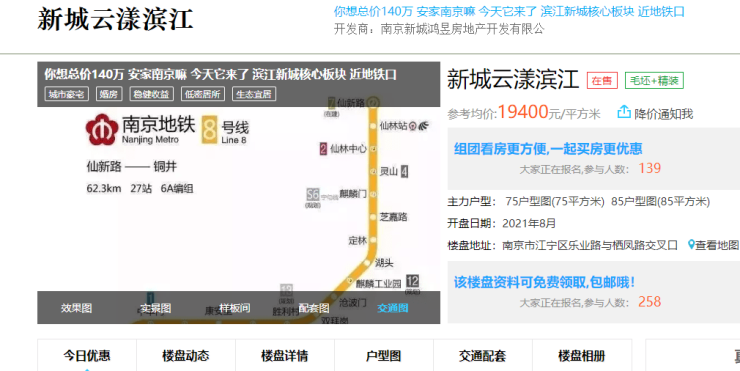 焦点财经梳理发现,位于南京新城·云漾滨江开发商为南京新城万嘉房地产有限公司。开盘日期为2021年8月,考均价为19400元/平方米,主力户型75平方米及85平方米,楼盘位于南京市江宁区乐业路与栖凤路交叉口。