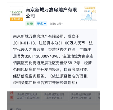 企查查显示,南京新城万嘉房地产有限公司成立于2010年1月13日,法人代表唐云龙,注册资本3.11亿元,经营范围为房地产开发与经营、自有住房租赁等。