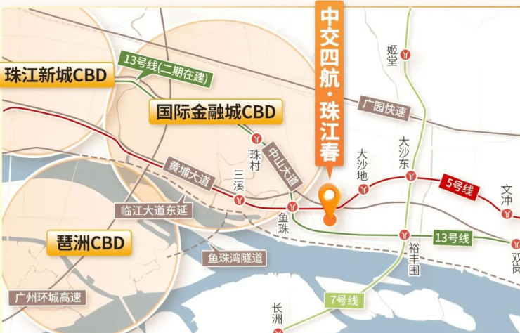 项目距离地铁5号线鱼珠站和大沙地站双地铁站约800米,目前就能通过地铁5号线直达金融城、珠江新城,未来13号线二期开通后,也通过鱼珠站直抵珠江新城。