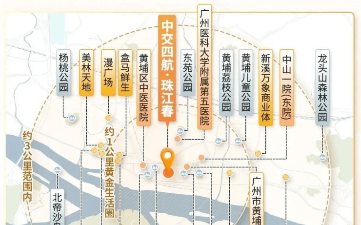 项目5公里可到达中山一院东院、广州医科大学附属第五医院、广州市黄埔区中医医院等。
