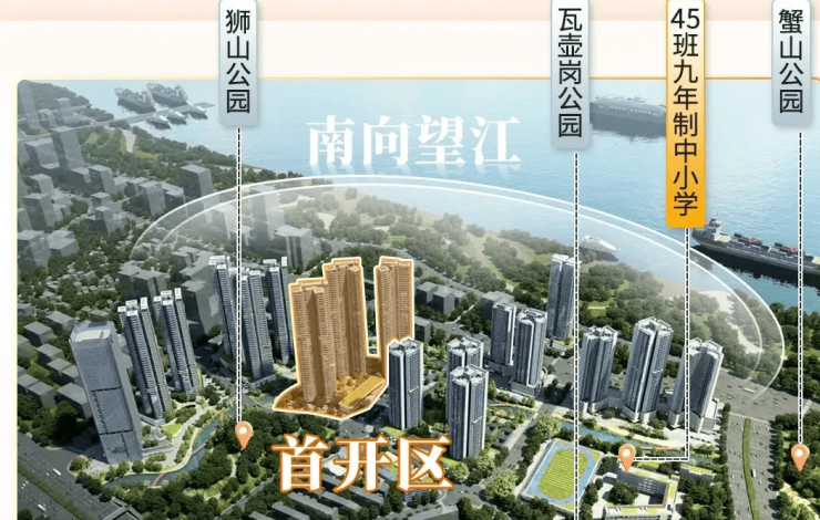 南向望江、三山环绕。项目距离江岸只有约250米。江面宽约630米。