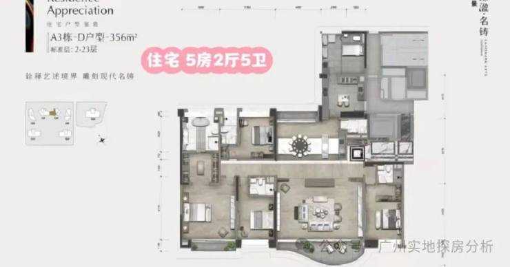 商业大平层有322平四房两厅五卫和403平四房两厅五卫两种户型,层高约3.5米。