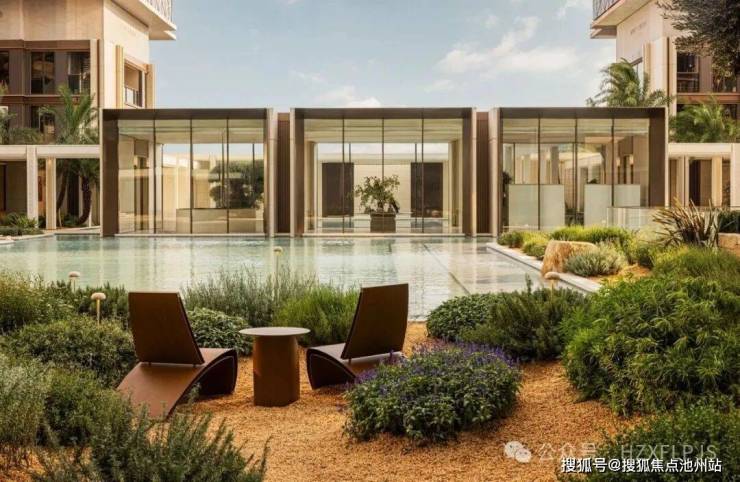 区别于传统园林的堆坡造景,中天海威·璟逸配置了蓝调泳池、低饱和度石材、旱岩植物、莱姆石通铺等组合,让整个园区内充满着极简度假风。