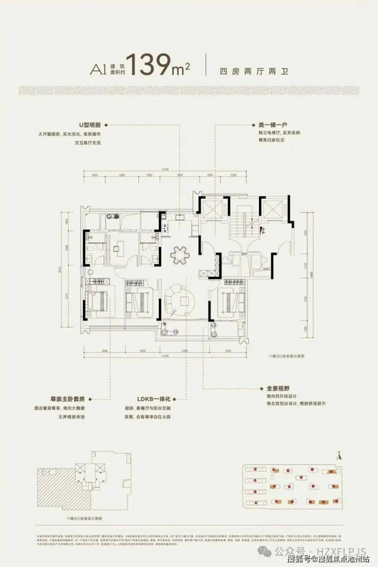 建面约139方A1户型,四房两厅两卫
