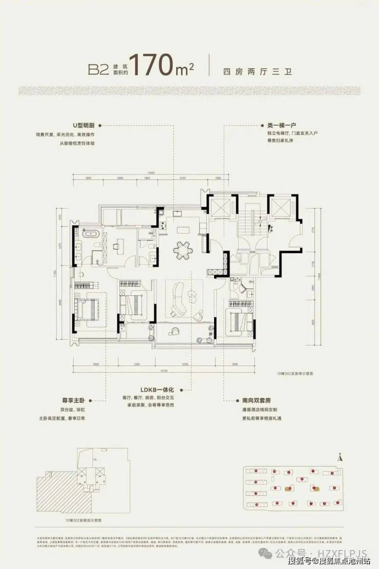 建面约170方B2户型,四房两厅三卫
