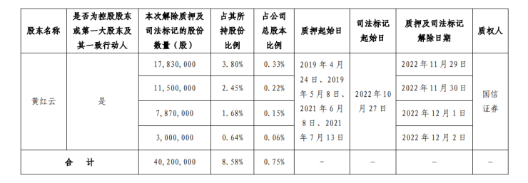 公告显示,金科地产集团股份有限公司于近日收到股东黄红云通知,获悉其所持有且质押在国信证券股份有限公司的部分公司股份解除质押及司法标记后分别于2022年11月29日至12月2日被国信证券强制平仓,合计被动减持数量为4,020万股,占公司总股本的0.75%,减持获得资金全部用于归还其在国信证券的融资,目前已全部清偿完毕。
