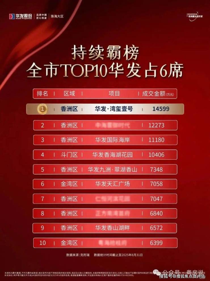 华发再次斩获珠海成交金额榜首!全市TOP10中华发占据6席,据克而瑞数据显示,华发2025年成交金额、套数、面积已连续8个月位居珠海TOP1,用实打实的业绩印证“龙头效应”。