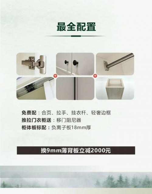 爱阁工房为每位客户提供最全的配置。严选18mm厚负离子板,配置推拉门衣柜送移门阻尼器。更有合页、拉手、挂衣杆、轻奢边框免费配。将全面细致的服务体现到每一个细节之中。