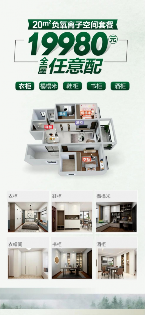 近些年来,随着社会经济的发展,人们逐渐意识到绿色生活的重要性。越来越多的家庭对于家装的环保要求逐渐提升,商家们也纷纷响应市场的需要,投入开发绿色环保的新型板材。爱阁工房自建立以来一直致力于绿色环保,坚持严选板材。近段时间,爱阁工房全新推出全新20㎡负氧离子空间套餐,19980全屋任意配。