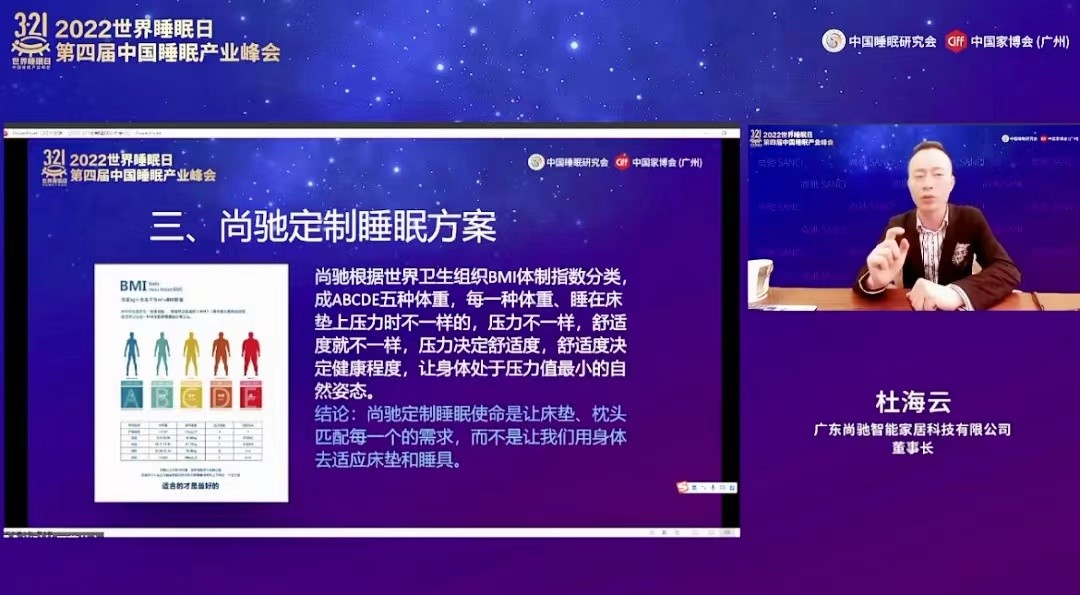 3月21日,中国睡眠研究会迎来了主题为“良好睡眠,健康同行”的第二十二个世界睡眠日,由中国睡眠研究会、广州中国家博会联合主办的第四届睡眠线上产业峰会,大会公布了2021年新浪健康养生睡眠年度总评榜获奖情况。本次会议及榜单评选旨在唤醒广大公众重视睡眠、改善睡眠的意识,提高其健康水平,推进“十四五”规划提出的把保障人民健康摆在优先发展的战略地位,坚定推进健康中国建设。在众多企业中,广东尚驰智能家居科技有限公司作为智能床垫企业的优秀代表,获评“2021睡眠产业年度品牌创新企业”。