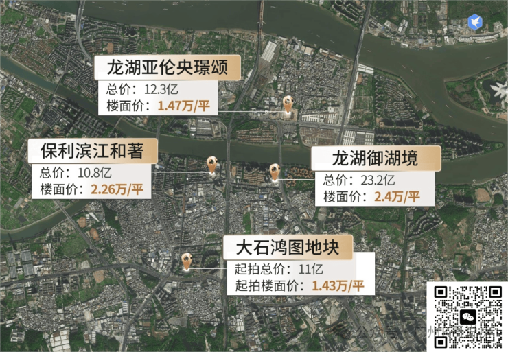 3、起拍价不高,总价11亿元,名义起拍楼面价约1.43万/㎡;目前板块内的保利滨江和著(大石新光西地块)、龙湖亚伦御湖境(大石迎宾路地块),楼面价都去到2万+/平,鸿图地块要便宜太多了;