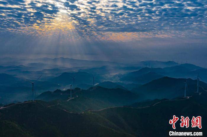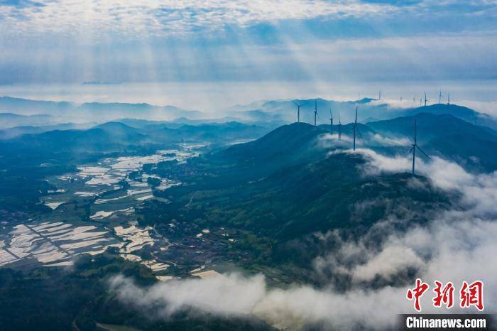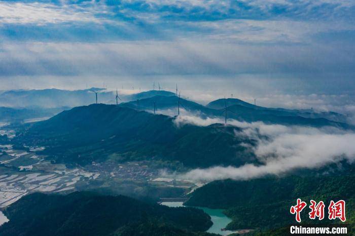 在江西省吉安市峡江县,安静自由的白色风车,像伫立于连绵山脉的守护者,划成一道亮丽的风景线。 李小明 摄