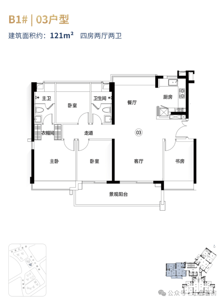 121㎡四房则更适合改善家庭,户型方正且南北对流,四开间朝南的格局让每个房间都能接触阳光,6.4米的阳台连接客厅,主卧带有独立衣帽间和干湿分离卫生间,门口的书房还可改作老人房,兼顾多代居住需求 。