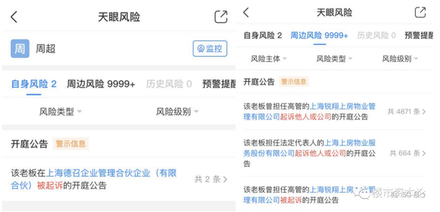 除此外,天眼查还显示,目前担任董事长兼总经理的周超,自身风险有2条,周边风险竟多达9999+条,大多数是担任锐翔上房高管期间的开庭公告。